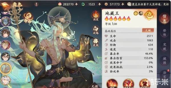 地藏王,能对敌方全体降低防御,还能复活队友,不过复活就看运气了。我们就用他来打伤害了,法宝就带众念,提高暴击率。如果没有众念要用其他法宝的话,披挂就换成4爆伤2暴击率。