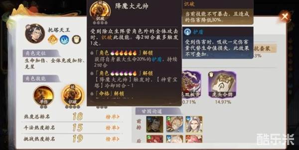 托塔天王,角色定位生命加伤、全体免疫加防、全体攻击克星,他的【识破】效果就很强了,在被除众生外的阵营的全体攻击时,敌方技能不可暴击而且伤害也会降低30%。大招神霄宝塔不仅能对敌方全体造成伤害,重要的是能给同排角色2回合免疫、提高防御。这样一来也是大幅度提高了整体的坦度!