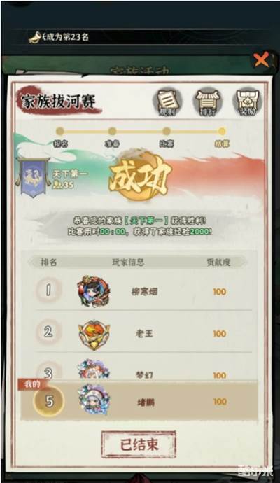 拔河是按照相近报名人数在同区和跨区匹配的(如果没有就轮空),如果轮空就默认胜利(排名按家族战力排名),如果报名人数不足五人无法匹配