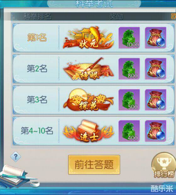 2.开始答题后,会计算答题时间,以正确率-总用时进行排行,第一名可以获得状元的称号。