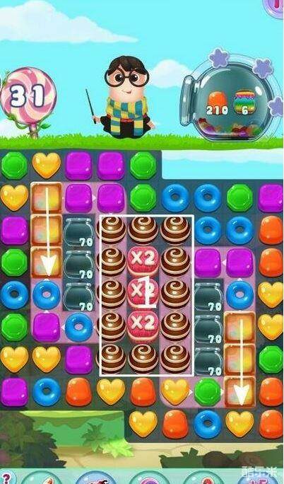 2、关卡中期着重于消除巧克力球,方便糖果消除。