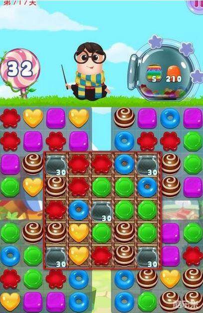 小编心得:这一关小编认为较难,因为产生橙色糖果只在图中固定区域,然而还有彩虹糖罐、巧克力球、巧克力棒在其中会加大玩家的进行游戏的难度。本关的重中之重就是想办法在中间区域多消除糖果,使染色池充分发挥作用。