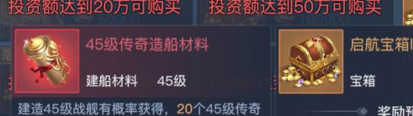 当投资额度达到要求时可以花费贸易币购买相应的启航宝箱,开启宝箱可获得传奇造船材料,限购一次。