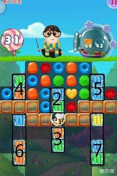 3、区域2~7为本关收集物泡泡产生物的所在区域,想收集泡泡只有通过这几个区域泡泡糖形成,但泡泡糖又被冰块所冰封,故破冰之旅势在必行。后期由于整个游戏局面的泡泡糖还是布落的比较散,一步一步来进行收集泡泡通关的可能性不大,所以尽可能利用特效来消除泡泡糖通关的可能性较大,毕竟随机飞出的泡泡位置也不固定。