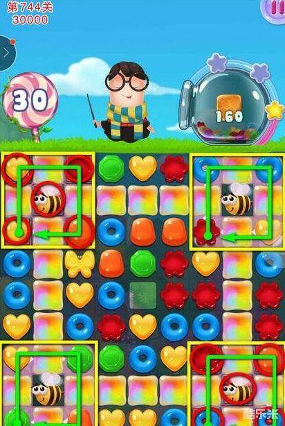 2.很明显,本关的首要突破就在于打开黄色区域释放出小蜜蜂,促使小蜜蜂形成更多的蜂蜜糖果。辣堡比较建议的是,小伙伴们先着重打开一个黄色区域,释放出一个小蜜蜂,这样在碰撞其他黄色区域的时候已经会有小蜜蜂形成的蜂蜜果酱的路径,有助于蜂蜜果酱的收集。