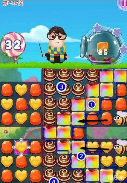 小编心得:这一关小编觉得考技巧比较多,因为要想大规模的产生蜂蜜酱,依靠特效是最佳的方法,所以啊,小伙伴们要记得尽可能多的在蜜蜂的相反方向形成特效哦,加油,祝三星!