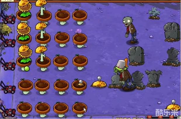 4、出现难度较大的僵尸放个红眼菇,被攻击的僵尸就会开始掉头攻击其它僵尸。
