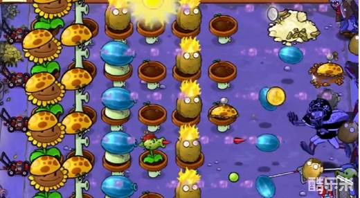 5、第一波僵尸出现后安放冰瓜大喷菇、双发仙人掌、雪花寒冰菇和火炬坚果。