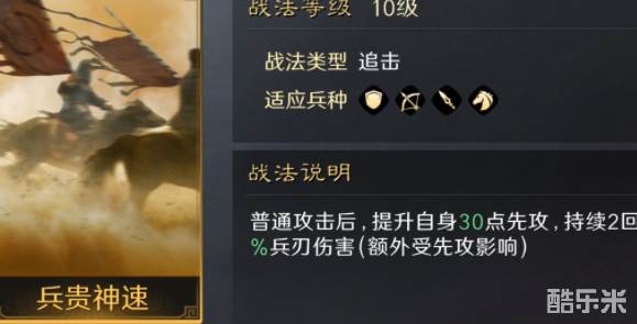 战法在三国谋定天下中有着极其重要的地位,要想打造出一套合适的阵容,除了武将之外,战法也必不可少,所以大家一定要了解每个强势战法效果,今天酷乐米小编来讲下三国谋定天下兵贵神速战法怎么用。作为橙色品质的战法,在玩家群体中也有着极高热度,但还有很多玩家不知道该如何去使用,一起往下看吧。