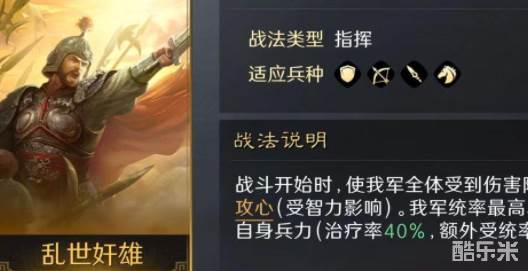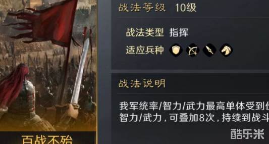 在三国谋定天下这款策略游戏中,对玩家来说最重要的除了武将之外当属战法,武将虽然有自身自带的战法,但是其他的搭配也很关键,百战不殆就是很重要的战法之一,今天酷乐米小编来讲一下三国谋定天下百战不殆战法怎么用。对大多数玩家来说,获得一个高级战法要消耗大量资源,所以一定要搞清楚具体效果并且做出正确搭配。