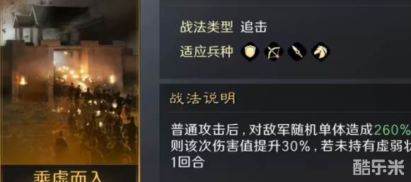 作为一个橙色品质的战法,大家要想获得乘虚而入需要在寻访中获得,招贤纳士,奇门八阵这两个卡包中都有可能出现。因为需要消耗的资源较多,所以要提前了解效果,该战法属于追击类型,有40%发动机率,在普通攻击后会对敌方随机一个单体目标造成高额兵刃伤害,如果目标身上带有虚弱状态,伤害值还能再次提升。如果对方身上没有虚弱状态,有一定几率为其施加虚弱。这样的战法效果就很考验配合,可以选择和具有虚弱的一起出战,也可以让那些能先手发挥的武将选择。