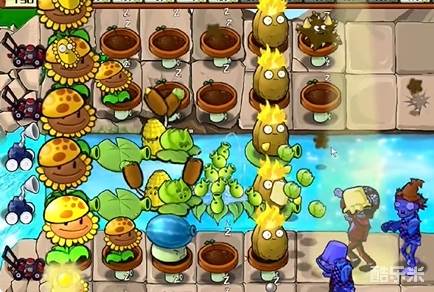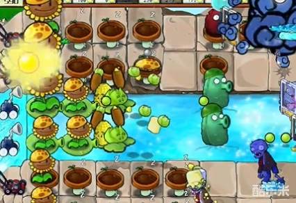 4、在玉米卷香蒲所在列种植四个冰冻西瓜大喷菇,在泳池中种植一个豌豆荚许愿池。