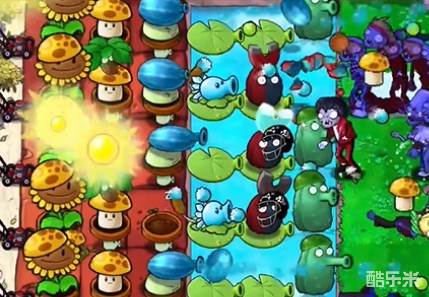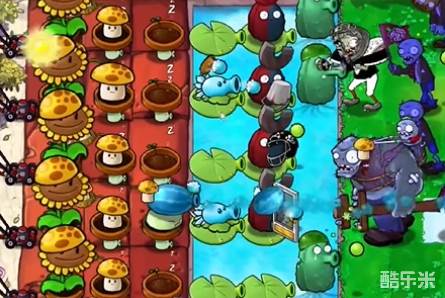 5、最后在瓦片上补齐两列冰冻西瓜大喷菇,在泳池中继续补充磁力坚果和高兵菇就可以轻松过关了。
