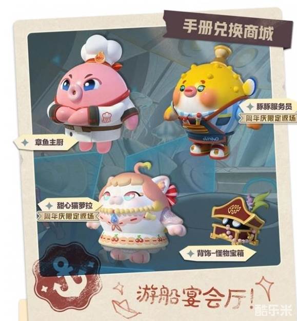 派对手册兑换商城梦幻焕新,典藏盲盒“章鱼章鱼”和典藏配饰“怪物宝箱”惊喜上架,同时典藏盲盒“豚豚服务员”、“甜心猫萝拉”也引来周年庆限定返场!黑帝斯号疑云重重,宴会厅更是卧虎藏龙。“章鱼主厨”一身洁白厨师服,四爪齐动快速出餐,以饕餮盛宴填满无穷无尽的欲望。而在默默无闻的昏暗角落,“怪物宝箱”悄悄掀起一条缝,邪恶的视线环顾四周,似乎酝酿起又一个阴谋。