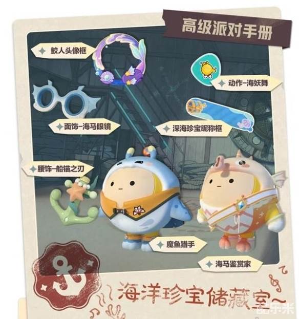 将派对手册升级为高级后,还能获得总价值3288蛋币的超值奖励。除了300蛋币、30彩虹币、20盲盒染色剂、20配饰染色剂外,还可获得稀有盲盒“海马鉴赏家”、典藏配饰“海马眼镜”、稀有头像框“鲛人头像框”、高级昵称框“深海珍宝昵称框”、典藏动作“海妖舞”、典藏配饰“船锚之刃”和稀有盲盒“魔鱼猎手”外观。