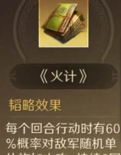 周瑜携带时利、火计、夺计韬略,与前两名角色不一样,周瑜携带都要增伤的书籍。时利能对负面效果的目标造成8%伤害提升,夺计造成伤害后谋略的伤害增加1%,最多可以叠8层。火计是比较适合火攻周瑜的输出方式,每个回合有60%的概率,对敌军随机单体施加两个回合的火攻。