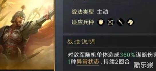 同时他的自带战法十二奇策,作为主动战法,能对敌方单体目标造成谋略伤害,并在此后对目标及一名队友施加随机的一种异常状态。