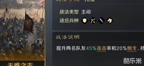 很多玩家在三国谋定天下中只关注武将自身而忽略了相应战法搭配,这样并不能达到最佳状态。武将可以学习两个战法技能都要精心选择,无难之志就是很好用的辅助战法,今天酷乐米小编来讲下三国谋定天下无难之志战法怎么用。辅助类型战法虽然不能直接造成伤害,但是可以使武将自身以及阵容中的其他角色发挥得更加出色,也是不可缺少的搭配方式。