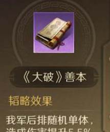 孙策战法制霸江东、疾行(顶配:锐不可当)、揭竿(顶配:势如破竹),其中非常关键的战法就是锐不可当,有破甲与徐盛的水攻叠加效果进行双减甲。兵书方面金专属的无惧是必备的,能概率施加畏惧,畏惧的效果也是有10%的易伤。然后是紫鬼谋提升8%主动战法的伤害,紫胜战,提升9%前四回合的兵刃伤害