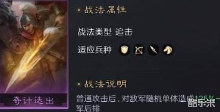 战法方面,自带红妆缭乱可以在普通攻击后对敌军单体目标造成较高的兵刃伤害,同时还会额外附加畏惧的状态,同时有概率额外造成一定比例的伤害,此外她携带的韬略效果风俗通义能提升骑兵的会心几率,并免疫混乱状态。