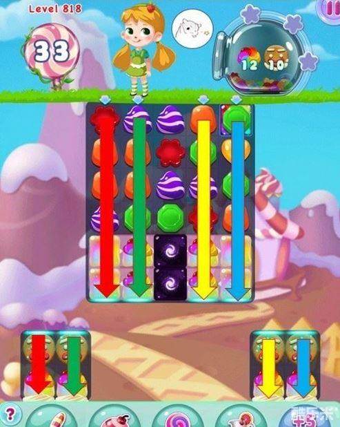宾果消消乐818关主要任务是收集12个彩虹糖和10个姜小饼。本关是有传送带的,而且还有传送门。四色箭头标示的是本关关键的竖向特效区,分别对应四个位置相同的传送门。传送带的移动规律是每回合逆时针旋转一格。下面我们一起来看一下宾果消消乐818关的过关方法。