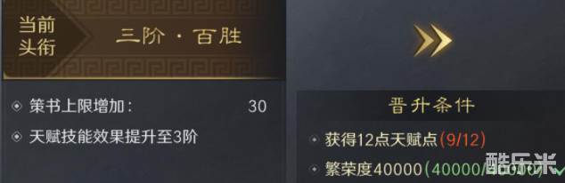 在《三国谋定天下》中,每个职业都有头衔系统,头衔分为五阶,每晋升一阶都需要满足一定的条件,包括获得一定数量的天赋点和达到一定的繁荣度。玩家可以通过参与各种活动和任务来获取天赋点和繁荣度,当玩家满足晋升条件时,就可以晋升。头衔只要晋升后,职业技能的阶级就会提升,而且还会获得额外的天赋经验奖励。因此,玩家需要密切关注自己的头衔晋升进度,并努力达成晋升条件。