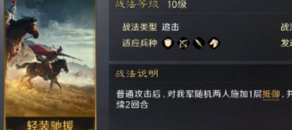 首先让我们来了解下“轻装驰援”的基础信息,这是一种追击类型的战法,它的特性是防御力量比较强大,大家在战斗中,每当发动普攻后,它都有50%的概率随机对我军中的两名武将施加一层“抵御”效果,并降低他们受到的伤害效果还是不错的,这种战法的获取方式主要是通过右下角的寻访功能获取,在“招贤纳士”和“金戈铁马”这两个卡包中有机会获得,可以试试。