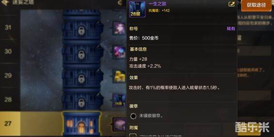 迷妄之塔过关后可以得到,通关28层能有“一生之敌”称号,每一层都不一样。
