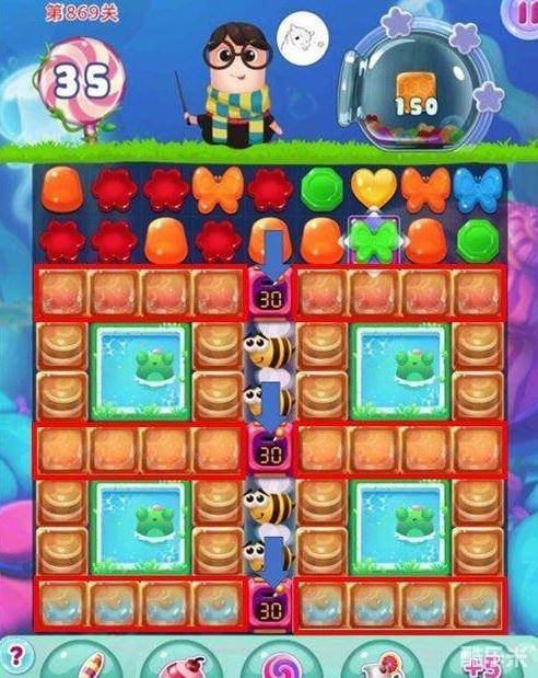 宾果消消乐869关主要任务是收集蜂蜜酱。本关咖啡布丁机是最先要被清除的障碍,请多多组合竖向特效来消耗它们,最佳的竖向特效主攻方向就是最中间可以同时打到三个布丁机的那一列位置。另外布丁机所护卫的水平区域中有三排冰冻同色糖果,能够合理利用就利用,争取把它们同时从咖啡布丁里释放出来做特效。下面我们一起来看一下宾果消消乐869关是怎么通过的吧。