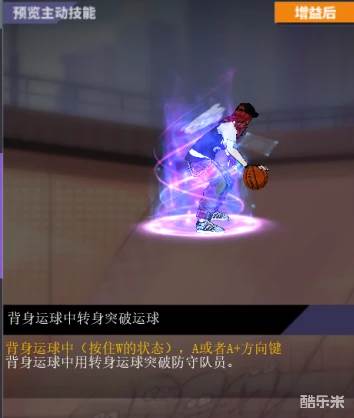 PG的背身运球中转身突破运球,下面简称:WA技能。它能够帮助我们快速的突破防守队员,从而获得更加的进攻或者地板位,辅助队友进攻。结合运用,它可以跟A人技能结合,使其连A(所谓的连A):←→(或者→←)WA接←→(或者→←)。连A很帅但是需要我们勤加练习,熟练做到无顿挫,才能在球场中发挥作用。PG的技能较为多,我们可以在技能预览中仔细详读技能介绍按法。