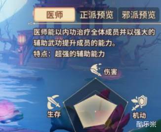 在游戏内,医师能以内功治疗全体成员,并以强大的辅助武功提升成员的能力。运用自身优点,为队友能力提供加成,是非常强力的辅助职业!