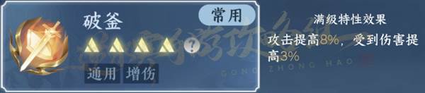 百分比提高攻击力,目前大多数玩家攻击为5500-6000。大概收益为3.2%-4%,大多数玩家在3.2%左右,面板非常好的破防流玩家可以达到4%。带灵韵收益为4.0%-5.0%。与之前不同的是,现在士气buff由攻击改成首领克制再加上会被其他百分比攻击稀释,现在本内破釜的收益还要降低。仅从特性来看,只推荐破防流玩家使用破釜。