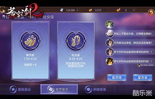 《苍穹之剑2》中的星座玩法是游戏一大特色,玩家进入游戏的那一刻便有了自己的星座,占卜星座运势可带来随机属性加成和道具奖励,同时与幸运星座一同开车试炼更加事半功倍。玩家还可以在星愿墙留言,与众仙友浓情互动,炫耀今日运势大吉,或是祈祷自己早日度过水逆。