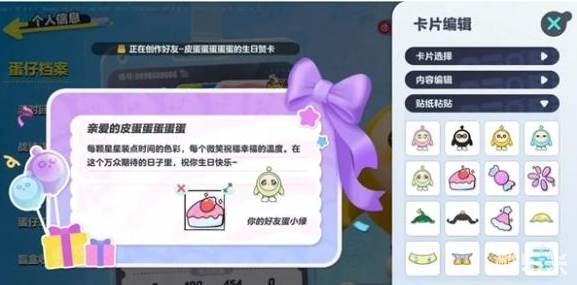 叮咚,你有一份生日祝福等待发送!当好友生日即将来临时,系统将发送专属生日提醒,邀请你一同为好友庆祝。在好友生日周内,点击好友个人信息即可寄送生日贺卡,蛋仔们可通过卡片选择、内容编辑和贴纸粘贴三大板块DIY编辑贺卡卡面,通过精美贺卡传递你的真诚祝福!