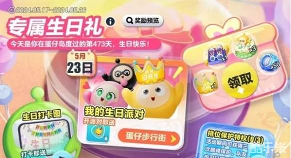 作为蛋仔岛最闪耀的生日主角,仪式感氛围感统统不可少!以主页设置的生日日期为准,蛋仔们在生日前6天至后3天期间登录游戏,即可参与【专属生日礼】活动,免费领取限时玩具“寿星王冠”、“生日眼镜面饰自选宝箱”、“青提奶油蛋糕”限次玩具等多重生日福利!更有3次排位保护特权,组队队友可同时享受巅峰保护,陪伴寿星蛋一同庆生!