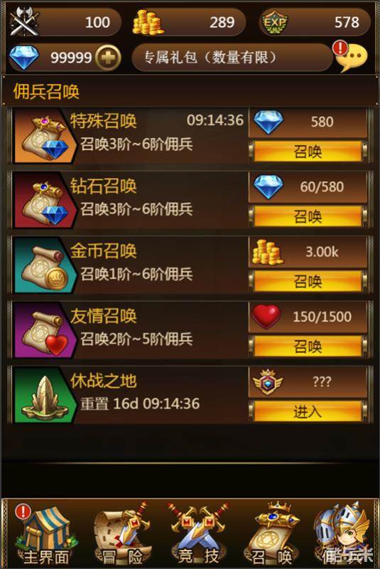 血钻召唤就是用血钻来抽,可以1次1抽也可以10连抽,10连抽会有3阶到6阶佣兵,并且每次至少有一个4阶及以上的佣兵;金币召唤则是用金币抽佣兵,1次1个,每次要的金币翻倍哦,会出现1阶到6阶佣兵;友情召唤则是好友互送的友情点数进行召唤,每天大概可以抽2次,可以抽到2阶到5阶佣兵;最后是休战之地,休战之地会随机刷出6阶、5阶、4阶佣兵,根据自己的需要可以用恩惠值兑换,6阶分为36000、24000,18000一个档次,5阶佣兵分为9000一个档次,4阶佣兵则是1000,。
