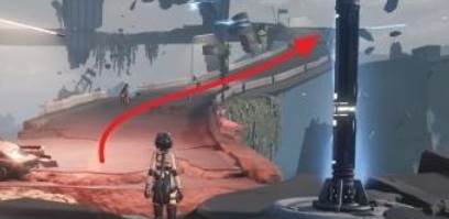 2、之后从传送锚点出发,沿着空中漂浮的公路往前走到下图箭头位置;