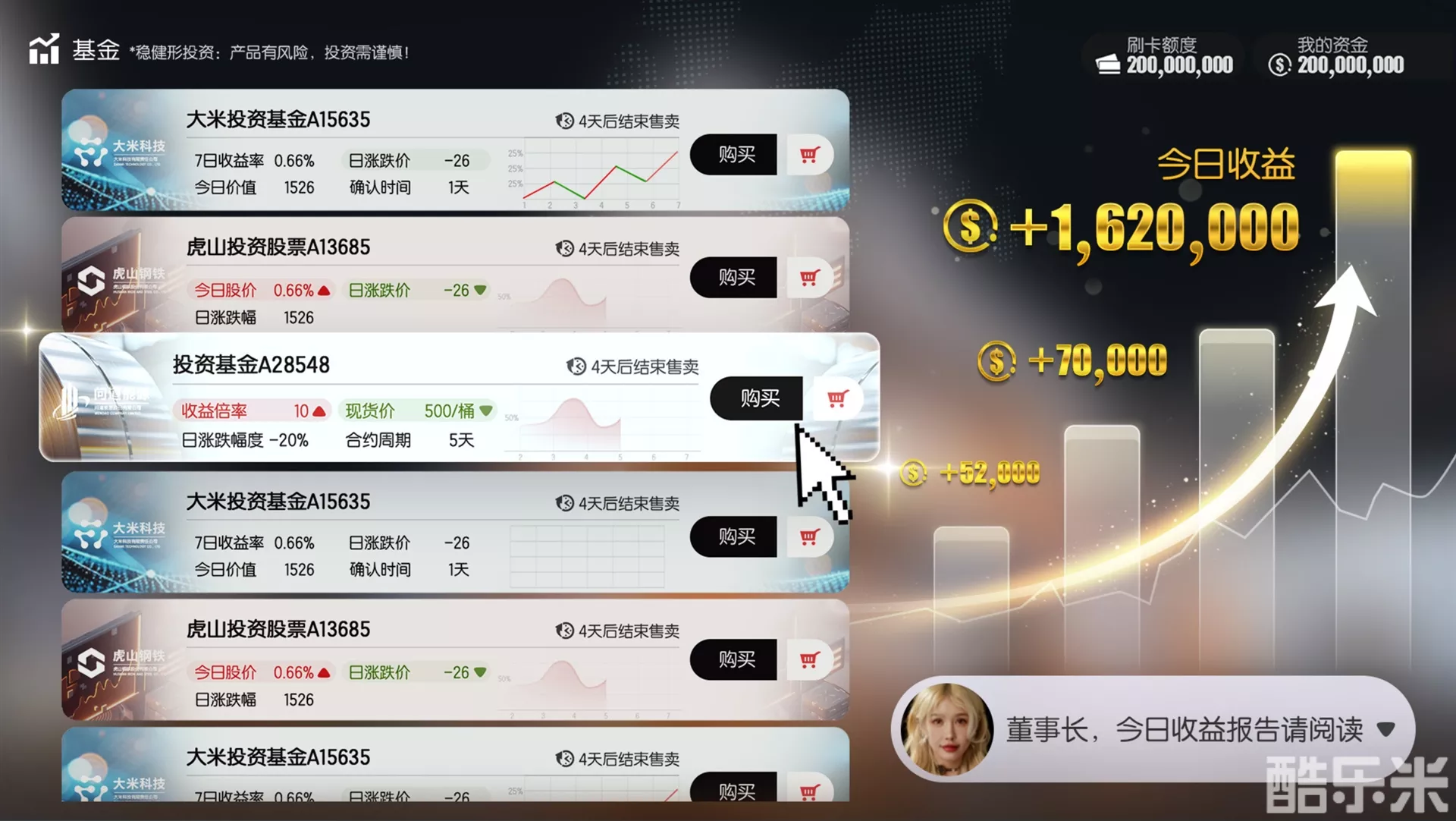 投资系统是《财产》在商店页中主要突出的另一大玩法,从商店图中展现的信息来看,玩家在游戏中需要自行选择基金股票进行投资,盈利多寡全由玩家自身决定,花游戏财产体验投资大佬的股市操作,怎么看都是稳赚不赔的买卖。