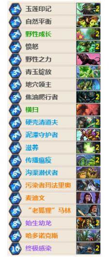 这是一套用来针对快攻卡组,整套卡组带上了足够多的优质嘲讽随从,甚至为此放弃了一定的跳费能力,没带激活、少带一张青玉绽放。在对上快攻卡组时,3费的焦油爬行者或者地穴领主都能大大拖延对手的节奏,传播瘟疫则能让对手绝望,而配合硬壳清道夫甚至能让对手直接投降。始生幼龙则是跳费成功之后最佳的返场随从。对上控场卡组时,我们的强度并不是特别高,但是麦迪文、巫妖王、马林都能给我们补充一定的强度,特别是马林,上限不可估量。此外,我们还有哈多诺克斯,能为我们提供一次强力的返场。