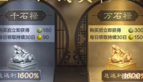 三国谋定天下的月卡分为小月卡和大月卡,对应的“千石禄”和“万石禄”,小月卡18元,购买后立刻给到180玉石,然后每天给90黄金,持续30天。大月卡30元,购买后立刻给到300玉石,随后每天给150黄金持续30天,无论是大小月卡总返利都在1600%,还是很值得买的。