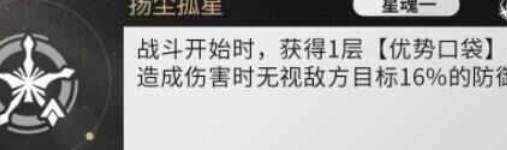 波提欧的一魂是无条件全覆盖的16%无视防御,同时战斗开始就会获得一层优势口袋。此星魂触发的优势口袋不符合额外能力【抵近射击】限定的处于嘲讽状态,因此不会额外获得10点回能。这个星魂最直观的提升就是无视防御,同时因为开局就有优势口袋,所以首动击破能直接触发天赋的额外击破伤害。