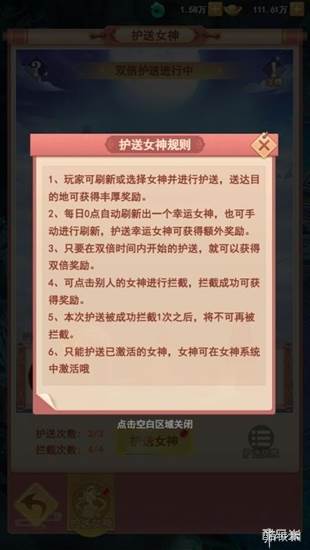 作为女神系统里面的趣味玩法之一,护送女神可是难得与自家女神培养感情的好时刻,况且每一次护送还有丰厚的额外奖励可以拿。不过由于女神们人气太高,所以护送女神也不可能一帆风顺,中途还会遭遇到其他道友们的拦截,说不得其中就有八戒派来的卧底,道友们可要注意小心提防。