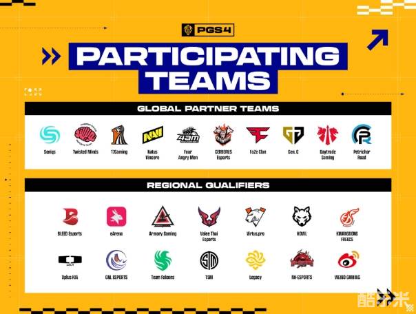 通过各个区域性赛事的选拔,共计24支战队成功晋级本次PGS3,所有战队会被分成A、B、C三个小组内,并通过3天的循环赛,角出前16名晋级总决赛。以下是进入总决赛的16支战队名单:TWIS战队、CES战队、NH战队、Soniqs战队、TSM战队、EA战队、VLTH战队、GNL战队、KDF战队、PeR战队、HOWL战队、KRG战队、FaZe战队、17Gaming战队、NAVI战队、WBG战队。