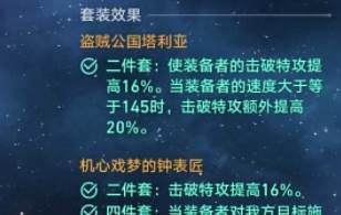想要组超击破队的话,可以给他们配置适合的遗器。遗器方面,同谐主角、加拉赫以及阮梅都可以用盗贼公国的内圈,大幅度提升击破特攻属性。外圈的话可以选择2怪盗套加2信使套的散搭组合,也可以选择4钟表套或者4怪盗套触发四件套效果。不过需要注意的是钟表套的效果不能叠加触发,所以他们三个中有一个人带钟表套就可以了。一般推荐让同谐主带,因为他虽然大招能量需要140,但是他的星魂和天赋效果都能回复大量能量,从而保证效果的覆盖率。遗器的属性只需要击破和速度,所以主词条无所谓,只有绳子可以从充能或者击破特攻里选择。剩下的都优先以副词条里的击破词条以及速度词条多的遗器里选择。