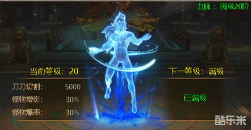 首先我们在主城找到血脉使者,我们用灵符去提升我们的血脉,满级20级后爆率和增伤都可以增加30% ,5000的刀刀切割!