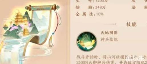 战斗开始时,将山河社稷图铺开,对敌方全体造成5000%天御神兵伤害,并为敌方随机3人施加【囿于一隅】持续5回合,为我方全体施加【天地之外】,持续5回合。