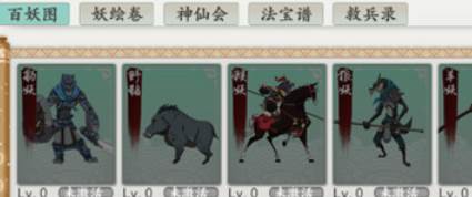 图鉴系统共分为【百妖图】、【妖绘卷】、【神仙会】、【法宝图】、【救兵录】五种: