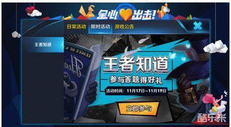 活动期间通过活动面板-限时活动进入王者知道界面,参与答题可以获得永久英雄/皮肤、英雄/皮肤碎片、改名卡、钻石、铭文碎片等好礼。
