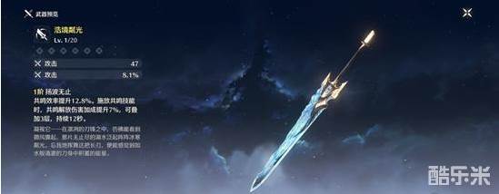 其次是五星武器浩境鳞光,提供共鸣效率提升以及大招伤害提升,可叠加3层,持续12秒。