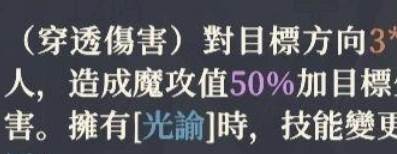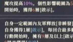 个性光谕,经典魔攻提高,自身范围五格内友军释放非瞬发技能后自身会获得一层启示,拥有九层启示时会获得光谕,可以使卡丽丝的专属技能进行升级,